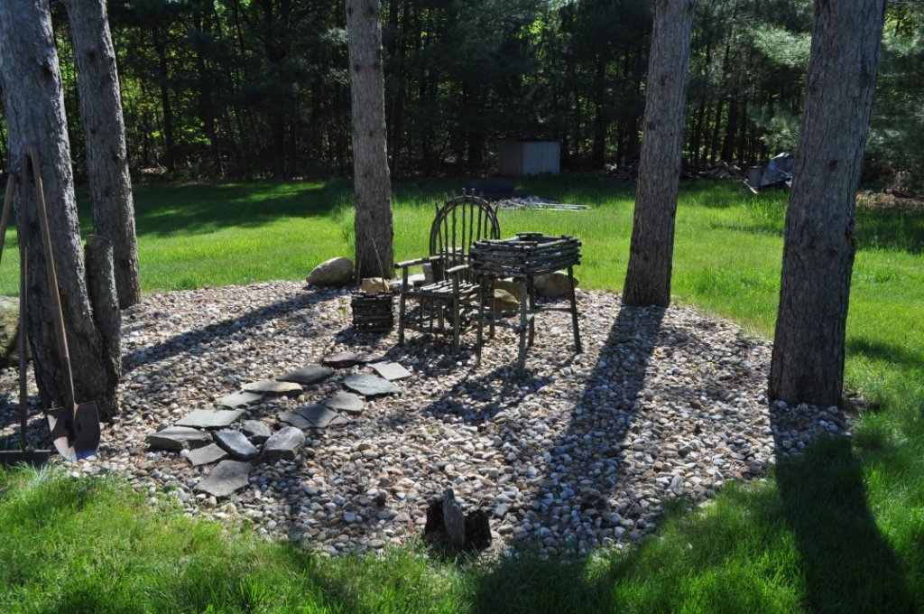 We had this "ring" of pine trees in our front yard. At some point after we moved here, my parents put rocks in it. My brother had made a chair, a basket, and a flower stand out of branches (with the help of our great uncle). It had been outside in the weather for a while and was getting kind of junky.